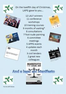 Our members benefit from our advice, support, training, events and regular updates. But we also play a leading role in campaigning for a fairer and more accessible legal aid system. We also press the government on the sustainability of the system and of those organisations trying to deliver legal aid services. Next year this will be more important than ever as the government carries out it’s review of LASPO and associated issues affecting legal aid and the justice system. LAPG will be heavily involved in that review and a stronger membership base provides us with a better understanding of the issues and a stronger voice. During 2018 we will also be supporting our members with the introduction of the 2018 Civil Contract and working with other representative bodies on the issues affecting criminal law practitioners.